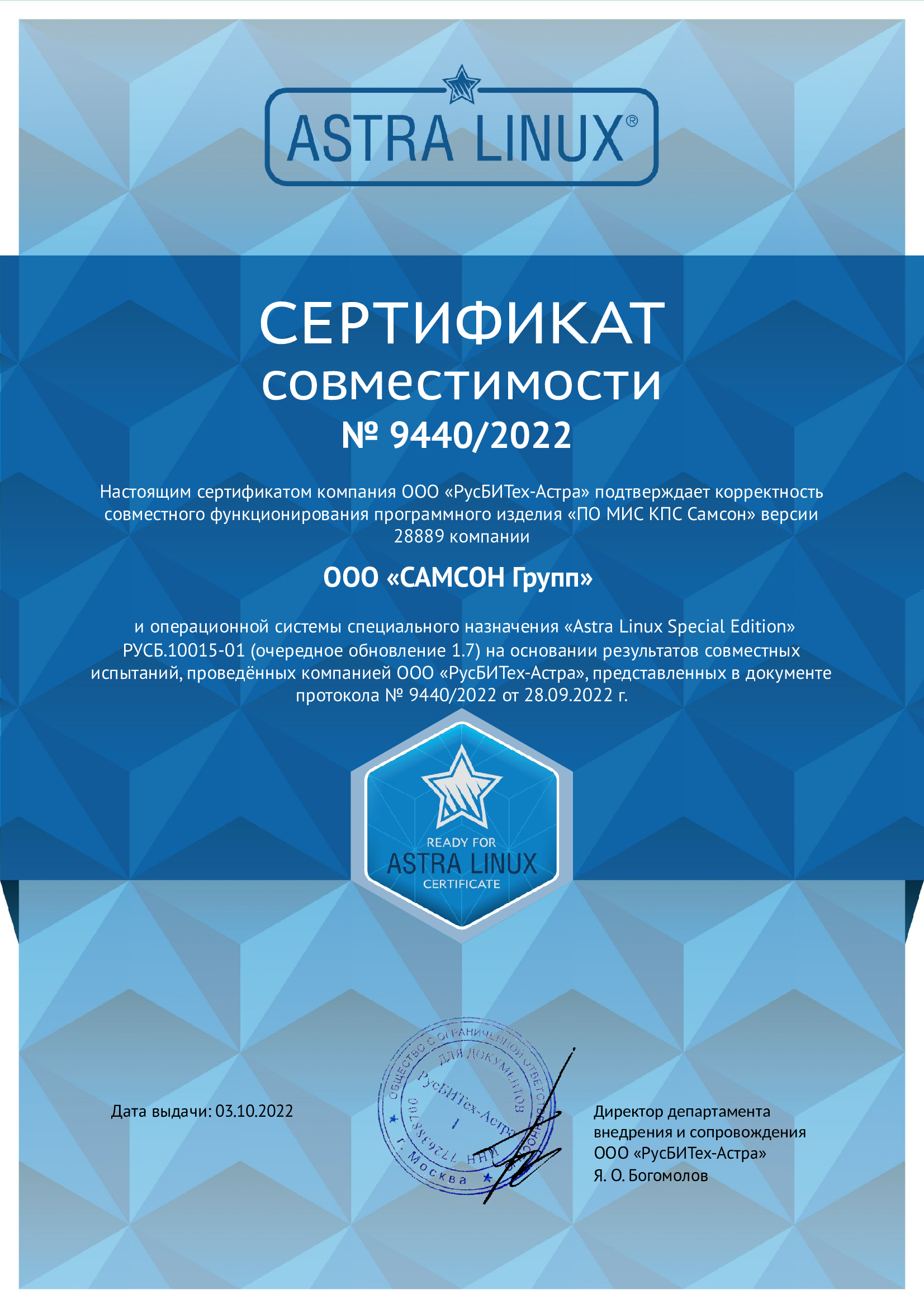 Буквально на днях мы получили СЕРТИФИКАТ СОВМЕСТИМОСТИ, в котором говорится о том, что компания ООО «РусБИТех-Астра» подтверждает корректность совместного функционирования программного изделия МИС «КПС «САМСОН» версии 28889 компании ООО «САМСОН Групп» и операционной системы специального назначения «Astra Linux Special Edition» РУСБ.10015-01 (очередное обновление 1.7) на основании результатов совместных испытаний, проведённых компанией ООО «РусБИТех-Астра», представленных в документе протокола No 9440/2022 от 28.09.2022 г.