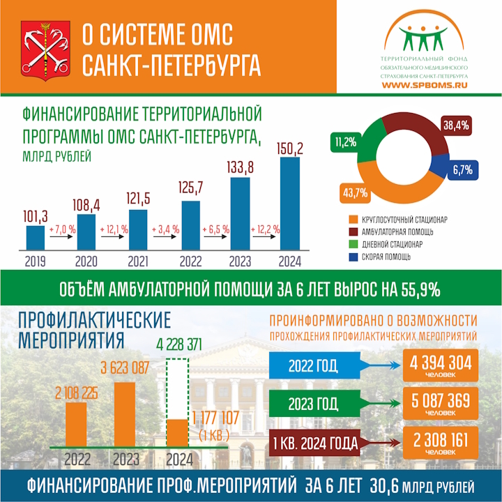 Объемы и доступность бесплатной качественной медицинской помощи в Санкт-Петербурге ежегодно увеличиваются благодаря увеличению финансирования Территориальной программы ОМС. За последние шесть лет ее бюджет вырос почти на 50 миллиардов рублей.